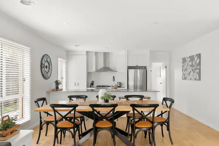 Living/Dining – Light & bright living and dining area, north orientation, hybrid timber flooring, high ceilings, downlights, roller/venetian blinds, split system air conditioning, ducted heating, sliding door opening up onto alfresco patio and sunny back yard