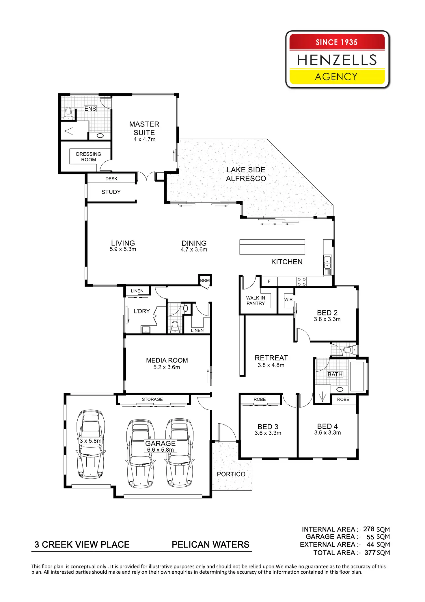 Designed for indoor-outdoor living, the open plan living area and kitchen effortlessly extend to the covered alfresco space, offering picturesque views of the large pool and serene lake. Additional spaces for relaxation and entertainment are provided by the media room and retreat area adjacent to the bedrooms.