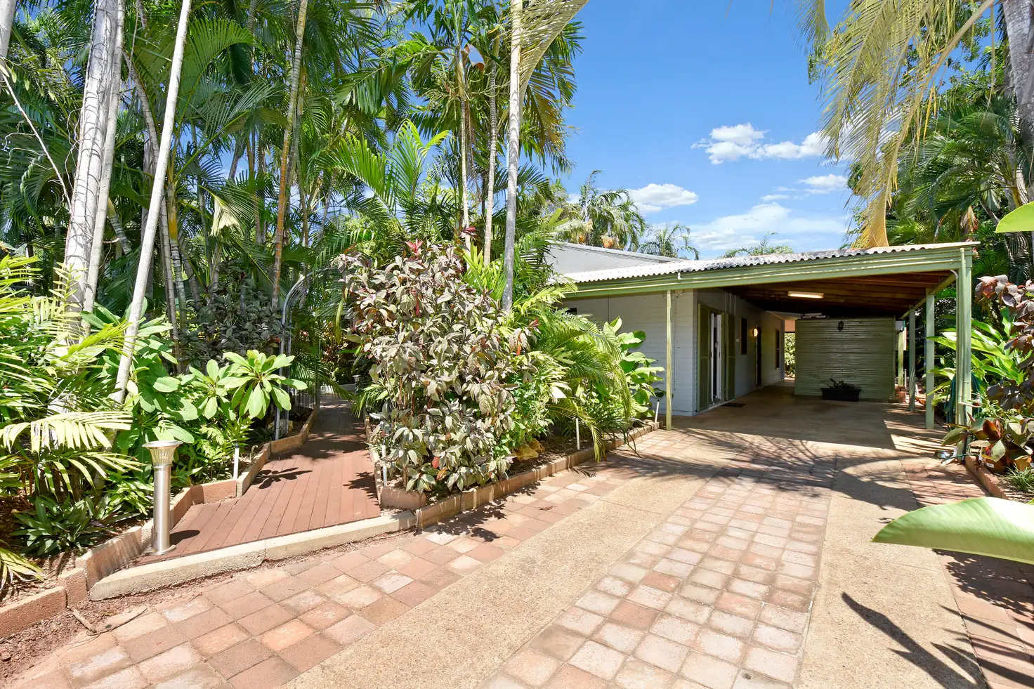 At the front of the home a long driveway leads up to a single carport parking space, although you can park another 2 in the driveway if you like. 6x170 watt solar panels installed on the roof that feed back to the grid. Board walk style paths lead throughout the tropical front garden beds taking in the flowering frangipani trees and colourful foliage that screen the home from the street and give this home a resort feel inside and out.