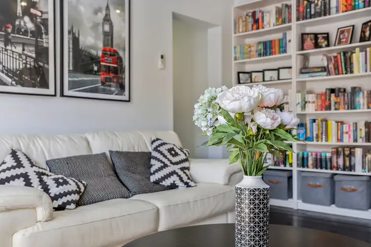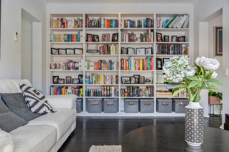 * Central living room with built-in bookshelves