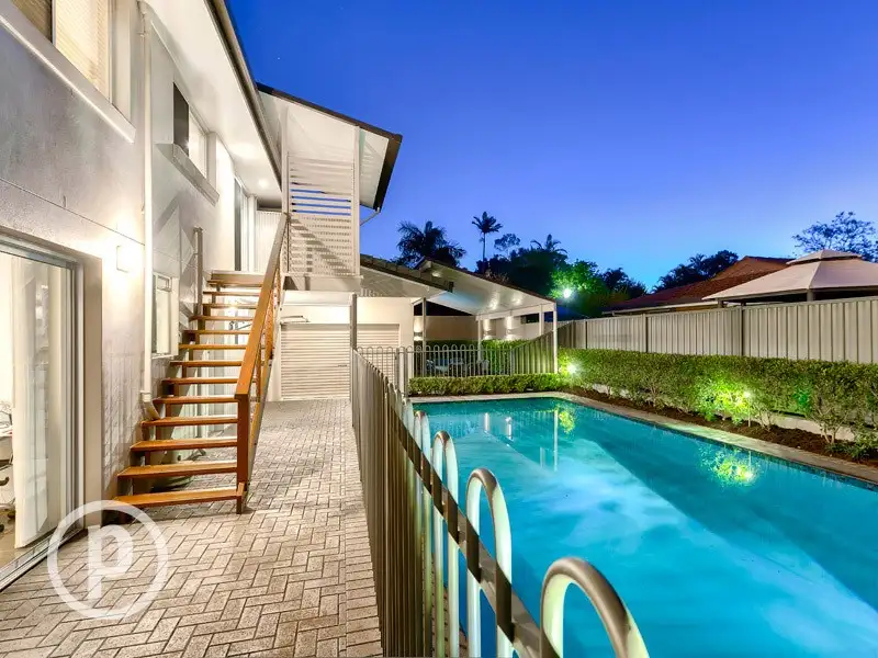 Dual glass doors open out from the lounge and dining areas, leading onto the elevated verandas that overlook the leafy surrounds and sparkling pool.