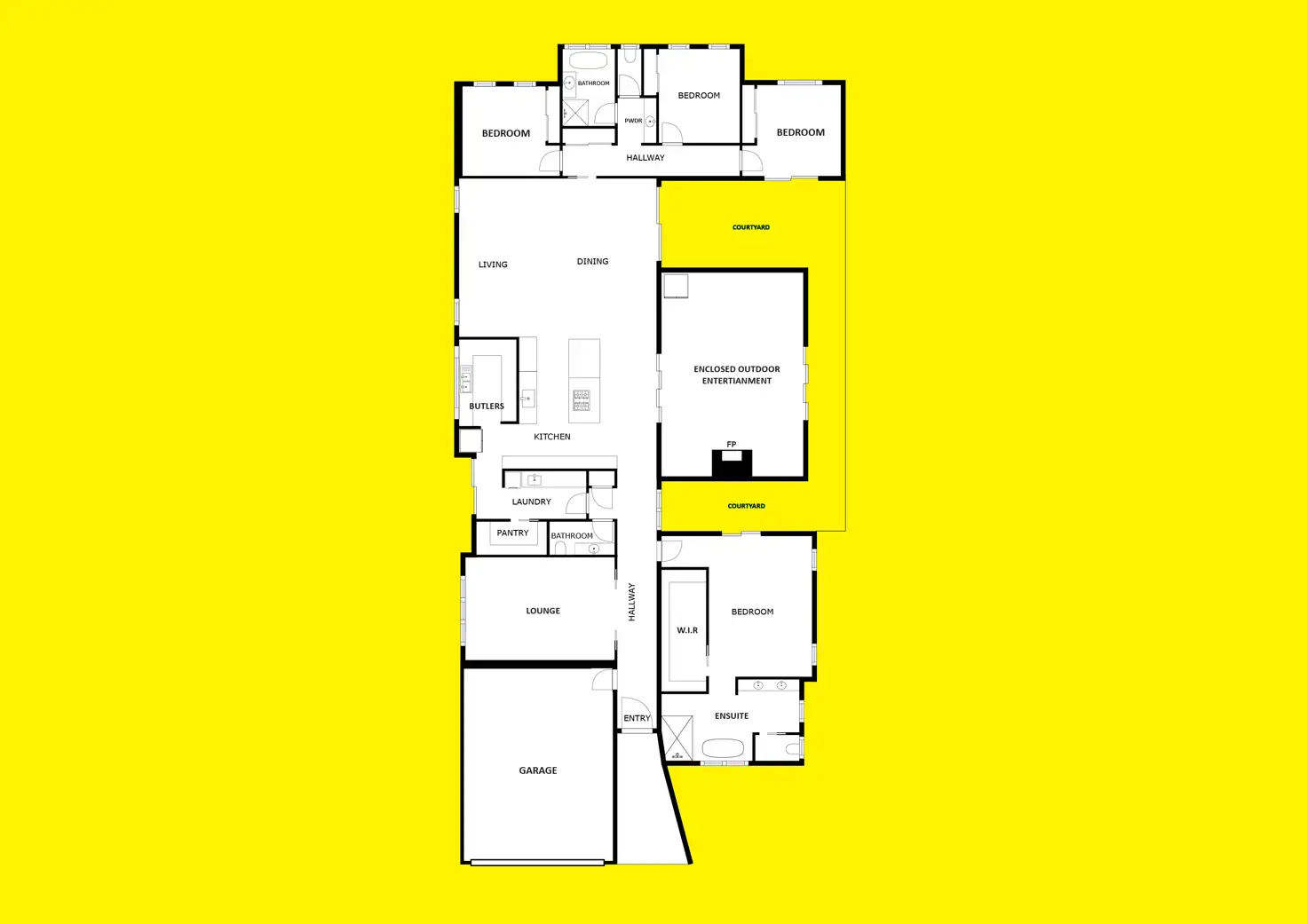 The heart of the home is a stunning black designer kitchen with stone benchtops, induction cooking on an island bench with downdraft exhaust fan, and high-quality Bosch appliances. The walk-in pantry with a splashback window enhances the culinary experience, while the separate lounge provides a peaceful retreat.