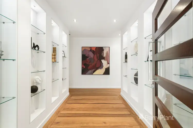 Hidden from street view beyond a high front fence and approach via a meandering path that leads past a trickling water feature to the wide front door, the home opens to reveal a substantial layout that leaves you wanting for nothing. Commencing with a glamorous entrance foyer that boasts the appeal of hardwood floors, high ceilings and stylish shelving, before flowing past an elegant lounge room enriched with a gas log fireplace, built-in speakers and a bay window that draws in glorious garden vistas.