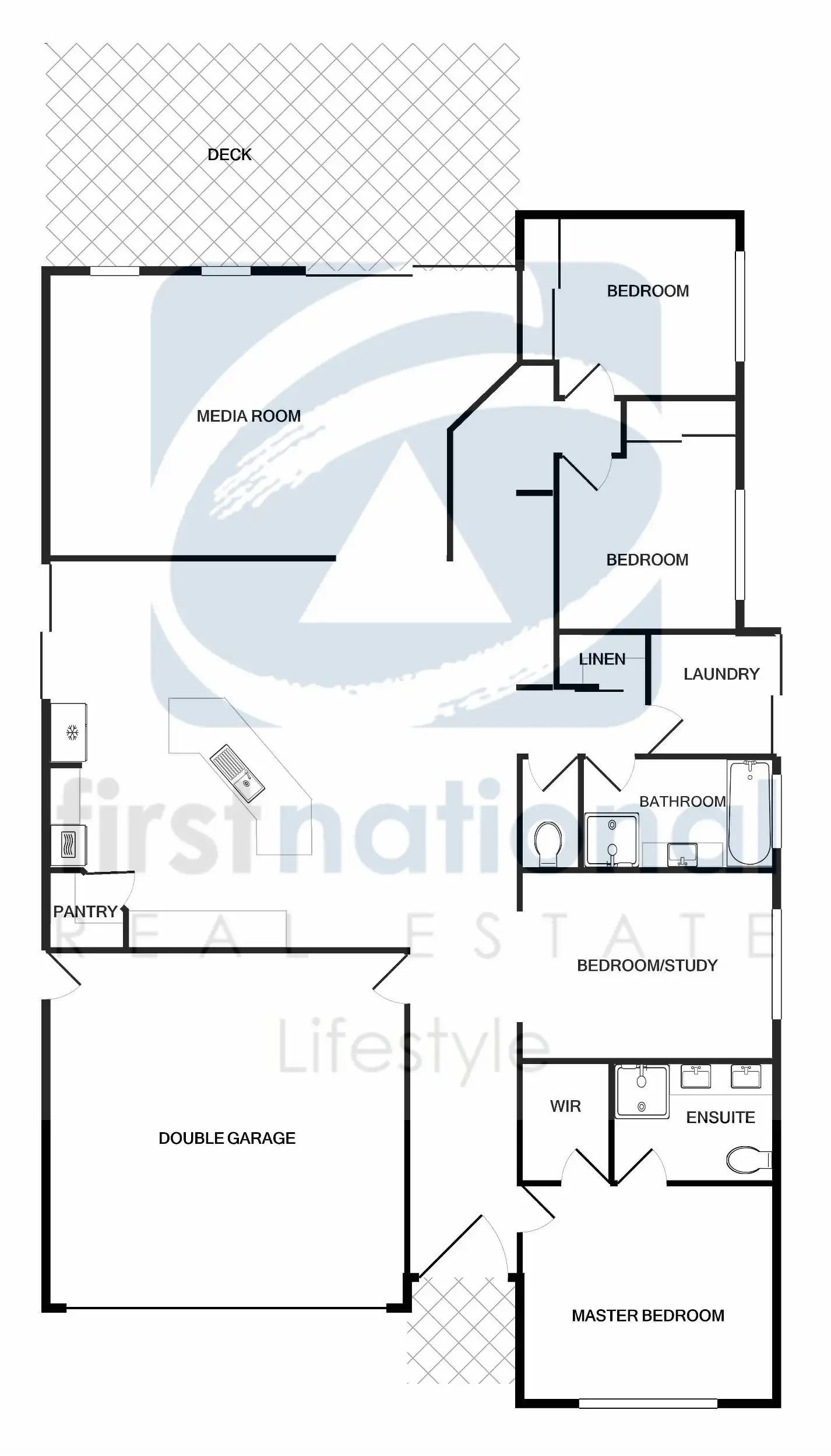 The wide hallway opens up to an enormous air-conditioned open plan living space, featuring a entertainer's kitchen, dining room, study nook and family room area. This room adjoins a huge media room at the rear of the home with gorgeous floating timber floors, which opens onto an oversized deck to the rear.