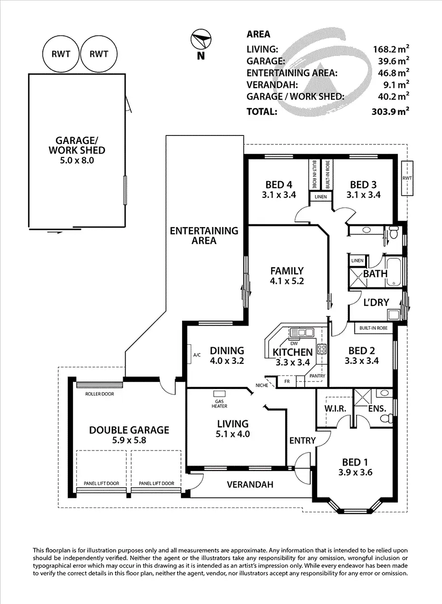 There is a two car garage under the main roof with remote controls and a single roll-a-door allowing access to the backyard and the 8m (26) x 5m (16) double garage/workshop which has a concrete floor & power. Also there is separate access for a trailer or boat. The gardens can be watered from the two 5,000 Lt rainwater tanks.