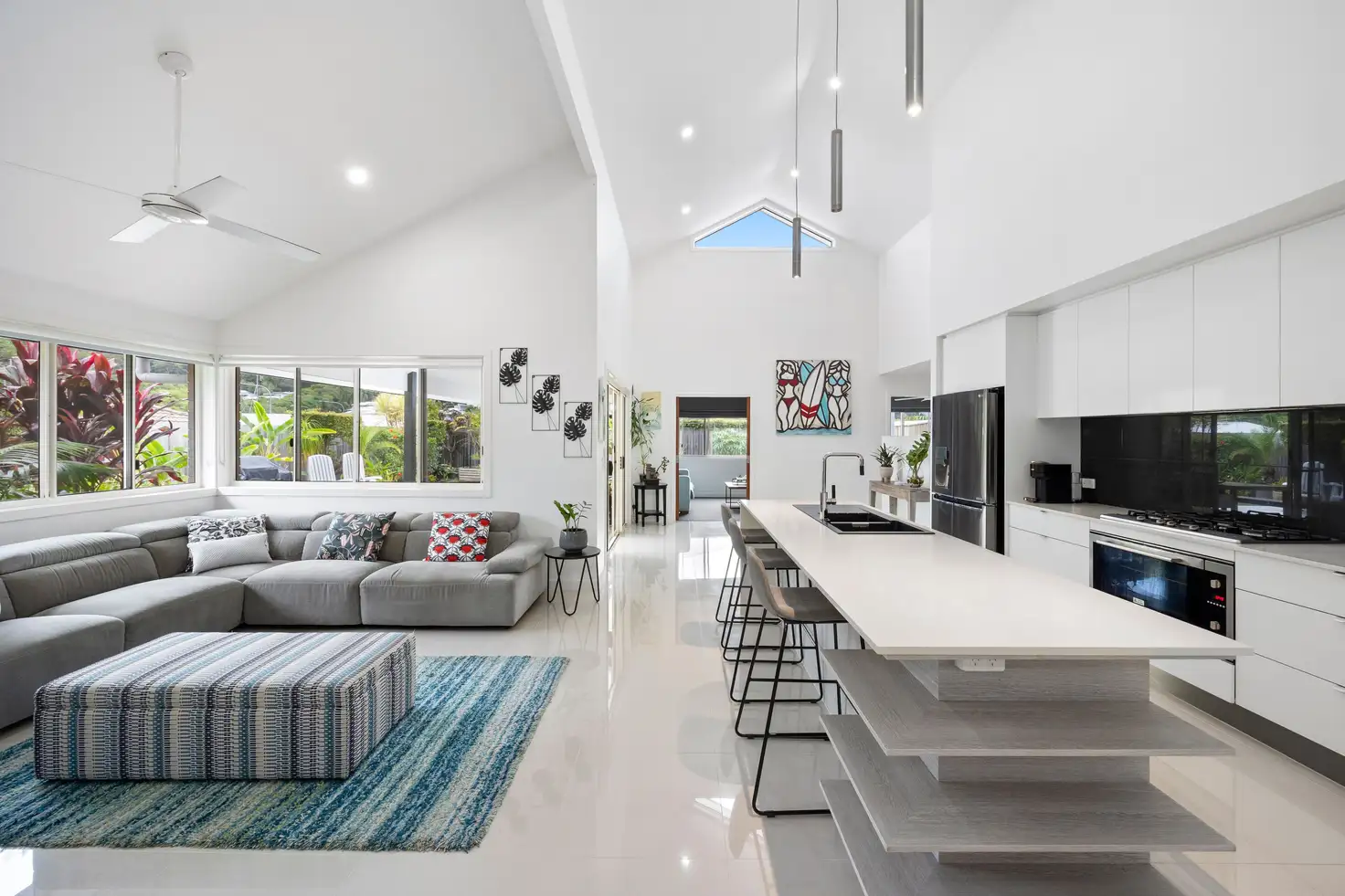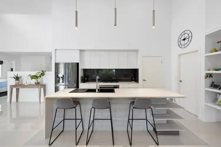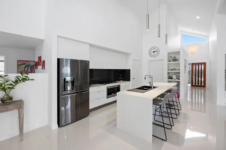 Step into the breathtaking open-plan living, dining, and kitchen area, enhanced by soaring ceilings and elegant pendant lighting. The kitchen is a true chef's delight, featuring gorgeous stone countertops, a lavish tiled backsplash, a breakfast bar, top-of-the-line appliances, and a spacious walk-in pantry. This culinary haven effortlessly transitions to the luxurious covered alfresco dining area, perfect for entertaining or enjoying quiet evenings outdoors. Additionally, the property includes a separate media/lounge room and a cozy study nook.