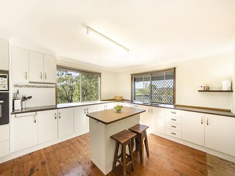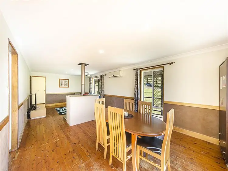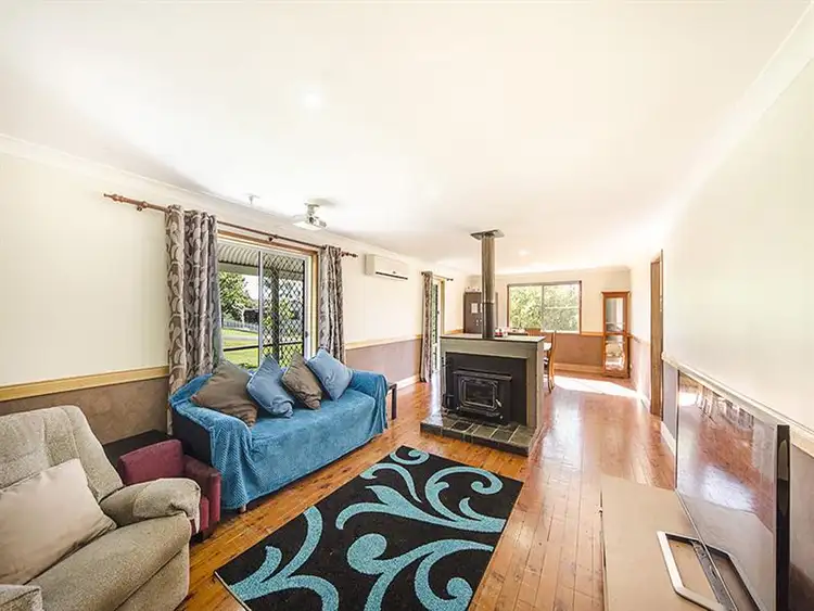 A spacious north facing bull nose style verandah leads to a private entry. To the left is a living and dining area, separated by a massive wood burning fireplace. Bonus in the living area of this huge room, is a ceiling projector included for family entertainment, and a split recycled air-con. Polished timber floors run through most of the house and bedrooms are carpeted.