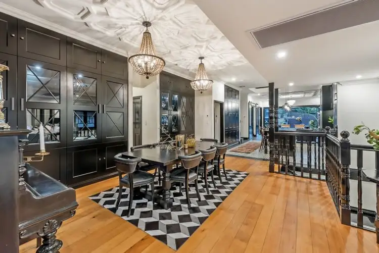 The open plan dining, kitchen and living features bespoke joinery in lustrous black and stunning, custom moulded ceiling panels. The kitchen is both beautiful and functional, boasting quality stainless appliances, including a Smeg induction cooktop, pyrolytic oven, integrated dishwasher, stone benchtops and a large breakfast bar, perfect for casual meals.
