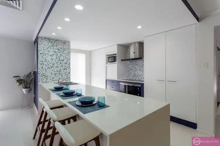 Navy kitchen cabinetry is offset perfectly by stone benchtops in the galley style kitchen, which has a double fridge space at one end and the option of two pantries or a pantry and appliance cupboard. A stylish EuroChef rangehood is an eye catcher above the ceramic cooktop and 900mm oven but the most striking feature in this space is the unique shimmering 'mother of pearl' effect mosaic tiles.