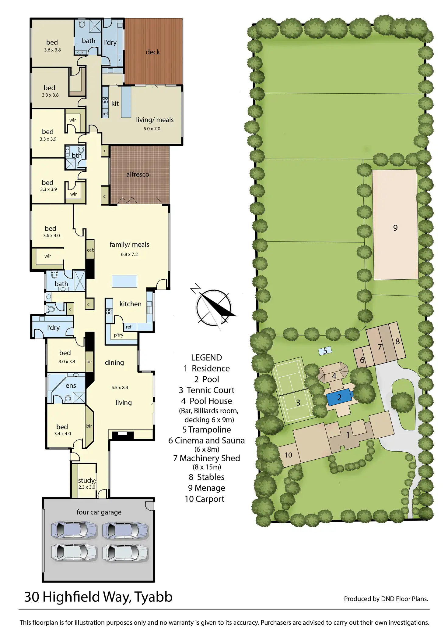 There is a solar and gas heated pool and spa, flood lit tennis court, outdoor pool house with wet bar, theatre room with built-in surround sound & projector, sauna, in-ground trampoline, shedding, chicken coop, barn and water tank.