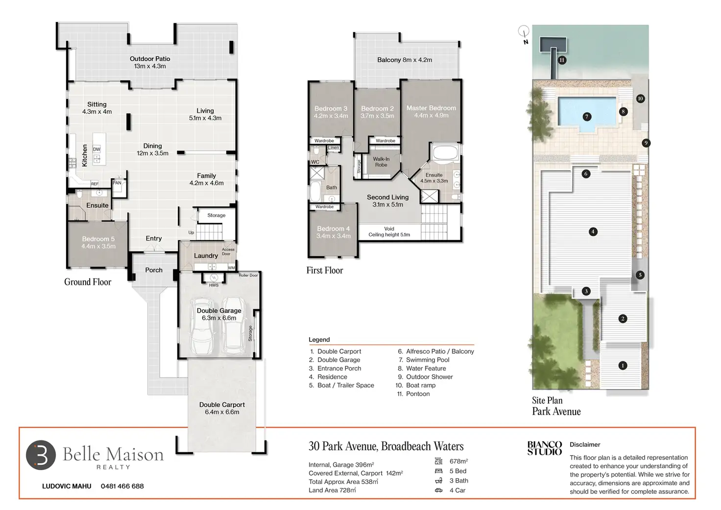 Five generous bedrooms, including a ground-floor guest suite (or optional media/rumpus room), provide exceptional flexibility for family living. Upstairs, the master retreat defines indulgence — complete with a spa ensuite, walk-in robe, and private balcony capturing serene waterfront views.