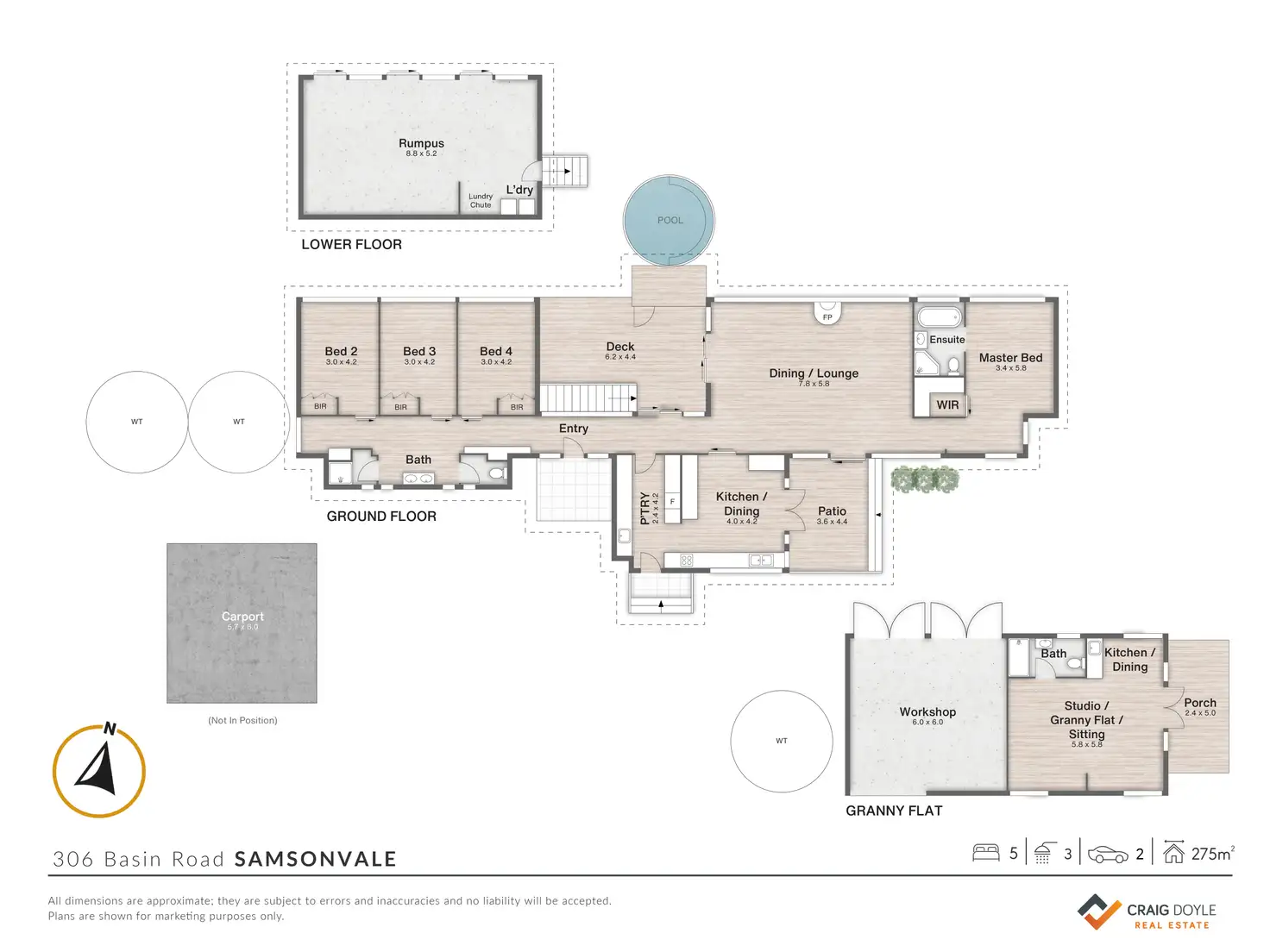 • Self-contained granny flat with kitchenette, bathroom, lounge and deck (Airbnb potential $125/night,)