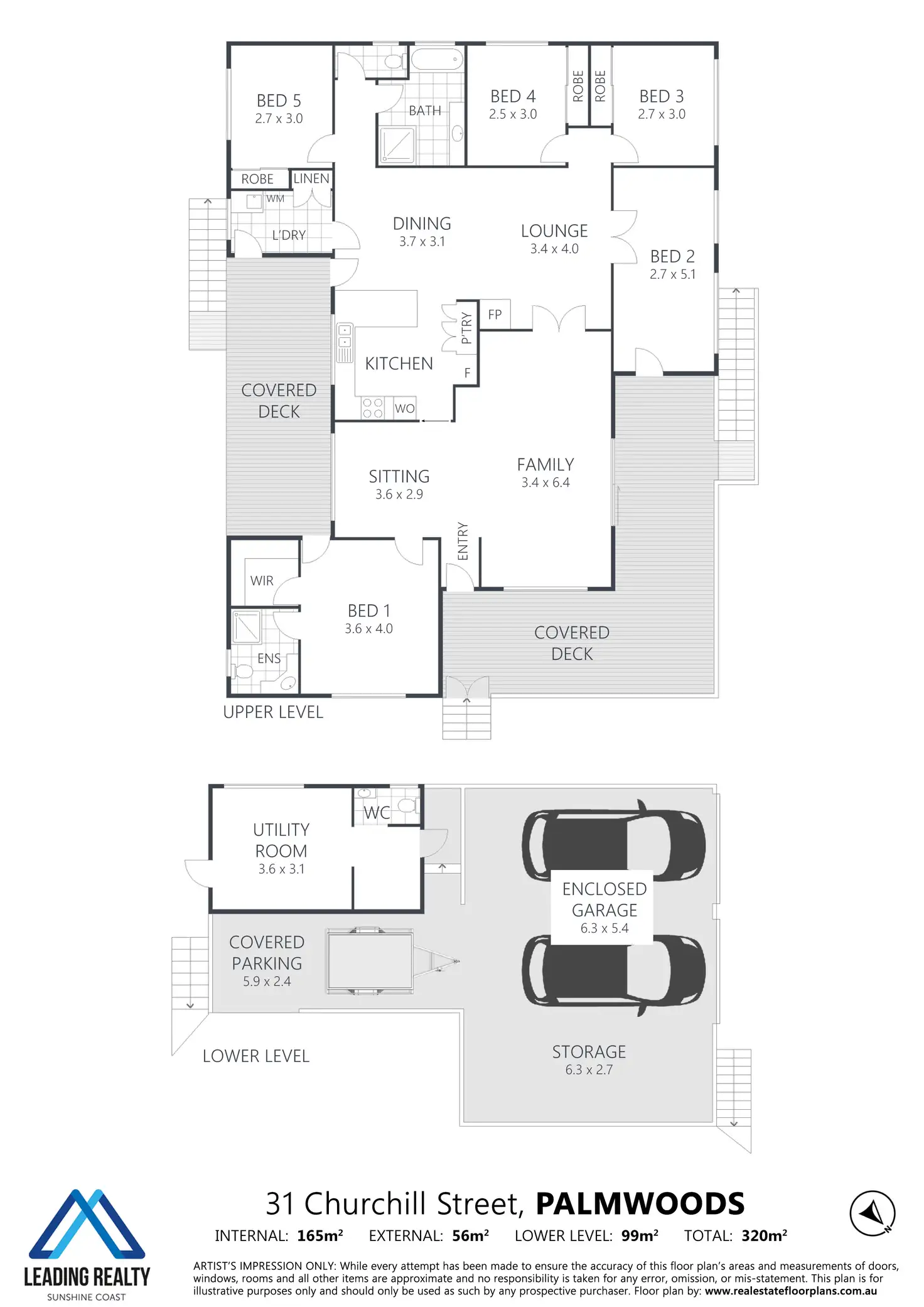 A highset design with parking, storage, utility room, and powder room under; the upper level comprises five bedrooms, two bathrooms, two separate living areas, two decks, central kitchen, and laundry.