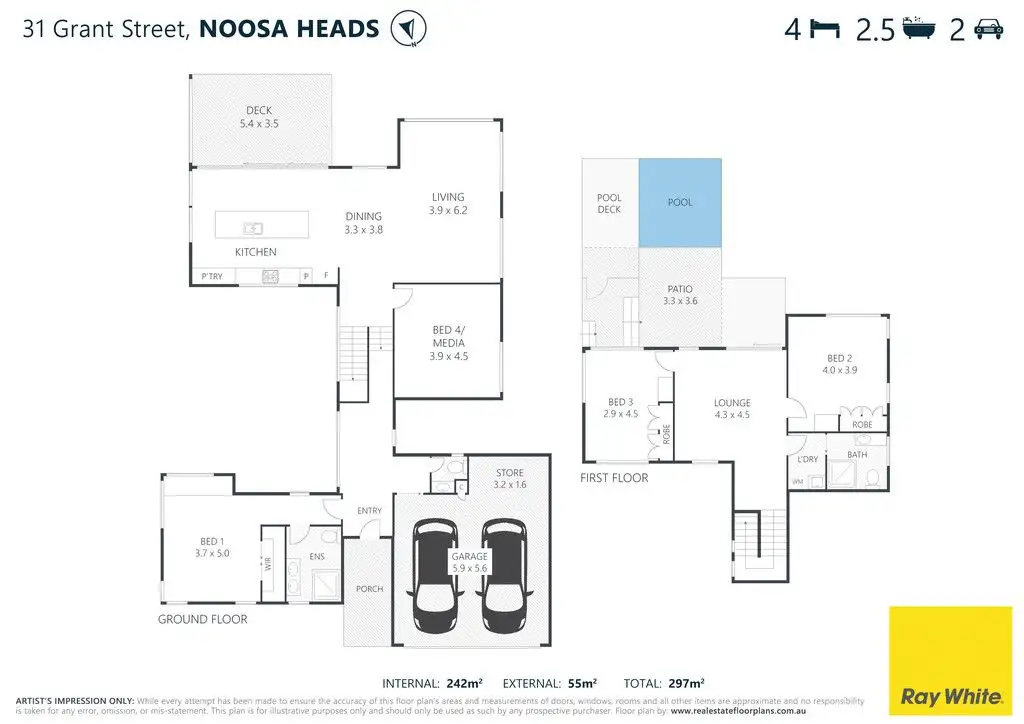 Split level, the home is complete with four bedrooms, two bathrooms plus powder room, two living areas, premium kitchen, upper and lower decks, plunge pool, separate laundry, and double lock up garage plus storage, on a 665m2 block.
