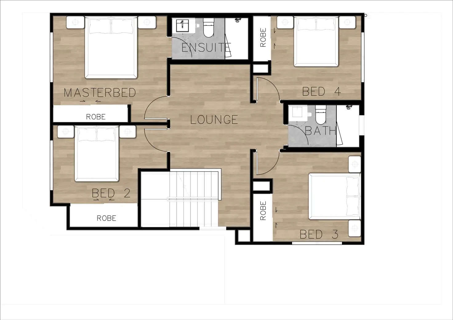 Upstairs, a central lounge provides a second living space, complemented by a generous master suite with a walk-in robe and ensuite, alongside three additional bedrooms with built-in storage and a full-height tiled family bathroom.