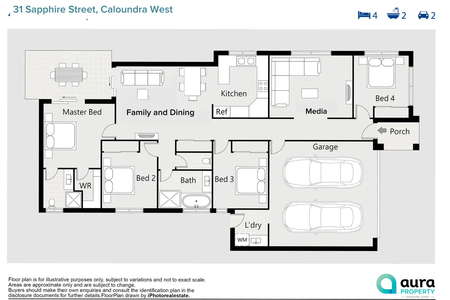 As you step inside, you'll be greeted by a meticulously presented home that's ready for you to move right in. With four spacious bedrooms, each equipped with a ceiling fan and built in robe, there's plenty of room for the whole family. The master bedroom boasts a walk-in robe and an ensuite bathroom and glass sliding doors opening up to the outdoor patio. The heart of the home lies in the light-filled kitchen, complemented by high ceilings in the open plan living area. It's a space that feels open, airy, and filled with natural light. Additionally, you'll find a separate media room, ideal for cozy movie nights or games hub. To keep you cool during warmer days, there are two split system air-conditioning units. And let's not forget about the double lockup garage, which offers ample space for your vehicles and storage needs. In the back yard there is a still more storage space with a garden shed and water tank.