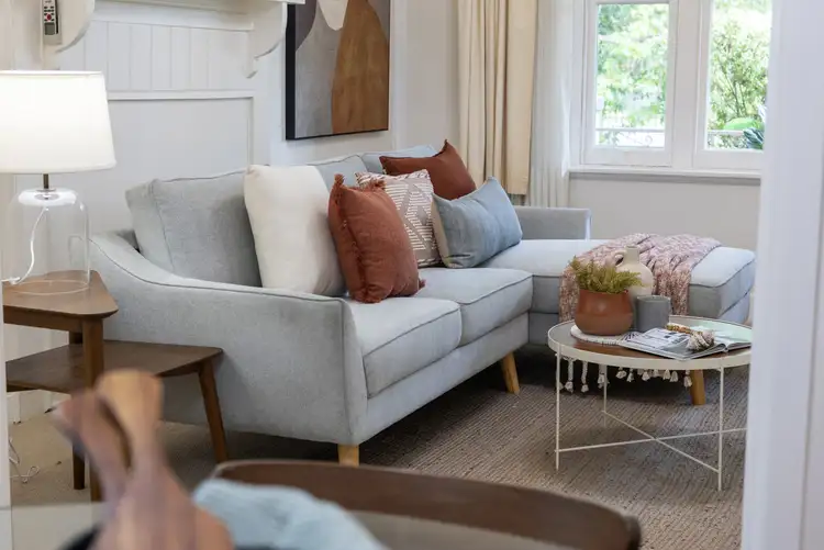 The living, dining, and kitchen space forms the heart of the home. The lounge at the front offers leafy garden views through large windows, while the dining area features a gas wall heater for cosy evenings. A split system air conditioner ensures year-round climate control, paired with excellent natural ventilation throughout the home.