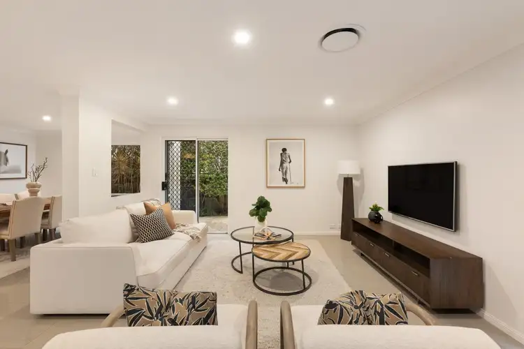 From the inviting facade to meticulously landscaped gardens, the interior impresses with tiled flooring, expansive hallways, a graceful timber staircase, and a tranquil neutral colour scheme. The ground floor seamlessly connects a spacious open-plan living and dining area to a well-appointed kitchen featuring high-end appliances, stone benchtops, a breakfast bar, and ample storage.