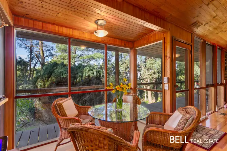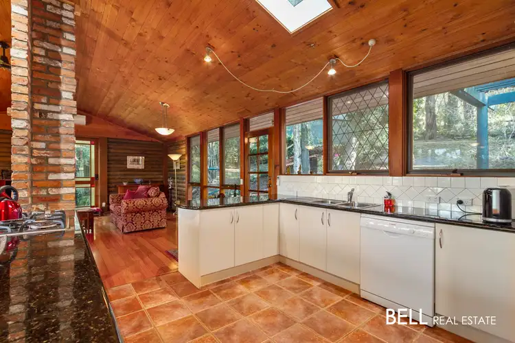 The spacious open plan living area features cathedral timber lined ceilings, polished floorboards, ceiling fan, windows with stain glass trims, a cosy wood fire heater, split system and gas ducted heating for your climate comfort. Included in this area is the meals area, an inviting nook surrounded by large windows providing beautiful garden views, the perfect place to relax with your favourite drink as you watch the native birdlife revel in the lush setting. The well-appointed kitchen will spoil the home chef with its abundant space, stone bench tops, large pantry and Bosch dishwasher.