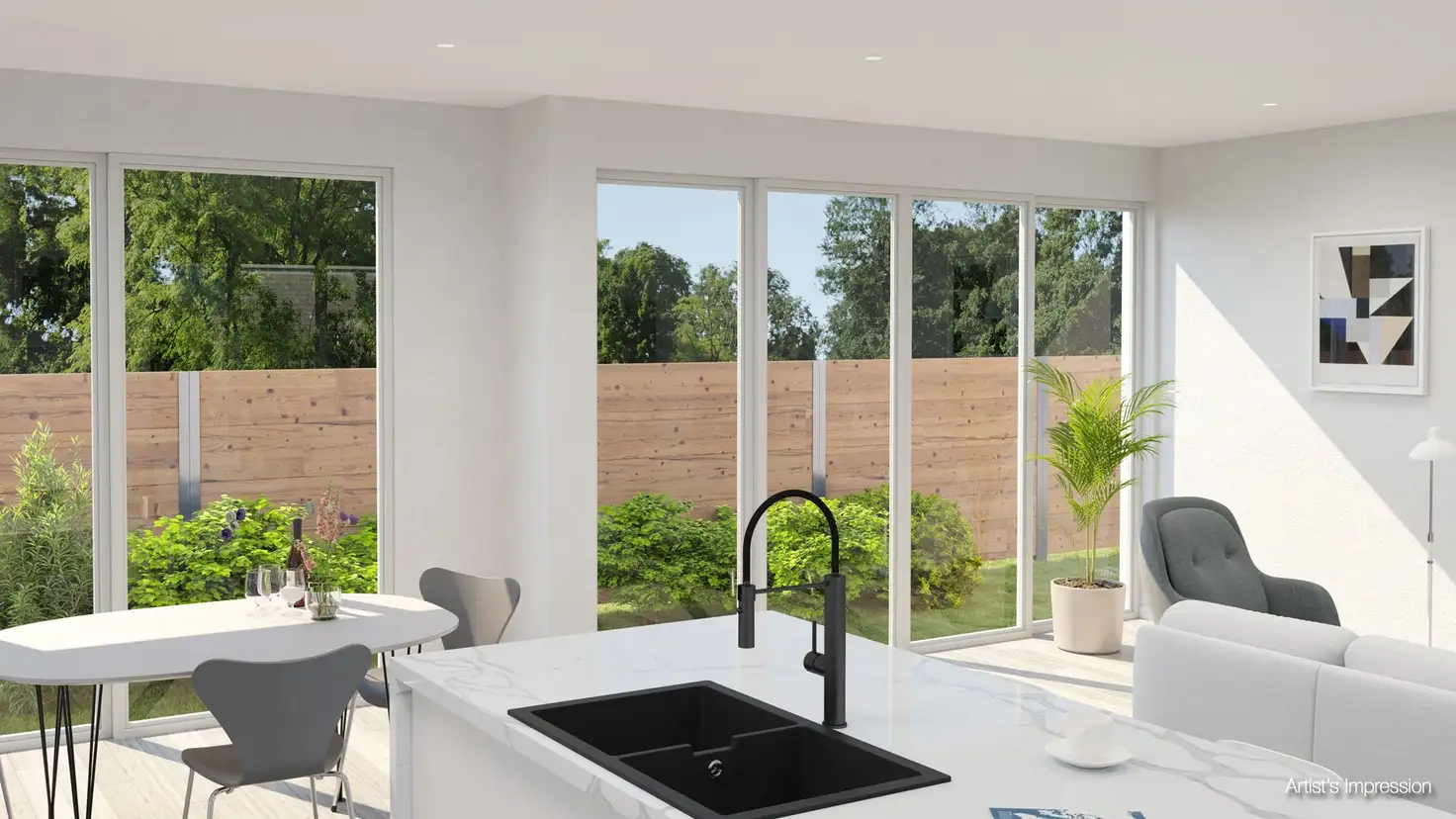 -Extensive glazing & sliding doors flood the interior with natural light