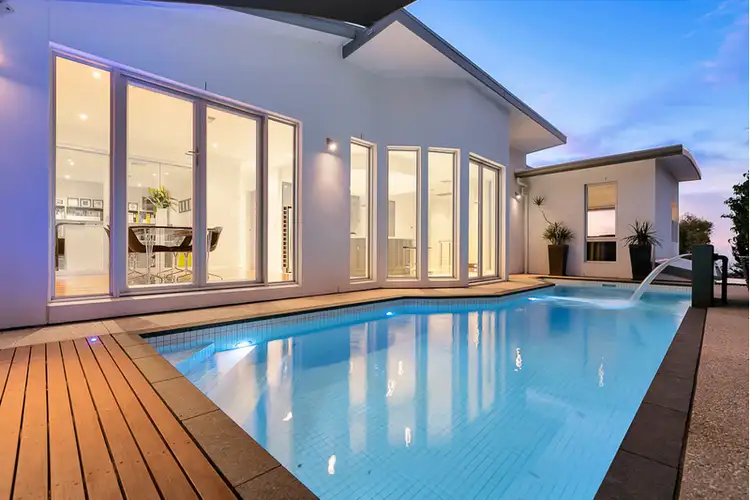 The fully tiled and gas heated lap pool is a focal point of the home, complete with timber decking, outdoor speakers, custom shade sails, water feature and outdoor lighting.
