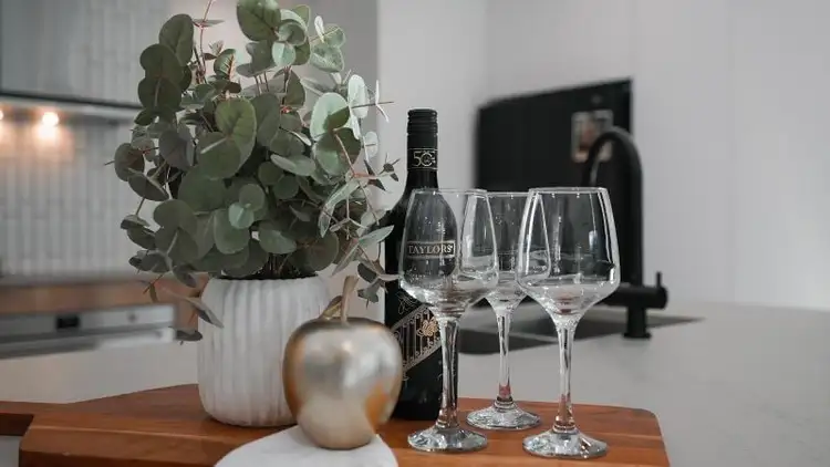 - Gourmet kitchen by EK Designs offers a huge central island with incredible matt stone benchtops and waterfall panel, rear seating and storage, 2-pack painted soft-closing cabinetry, double under-mounted sinks, extra tall feature overhead cupboards, a large pantry with practical built-in drawers, 90cm Smeg oven, fully integrated dishwasher, twin pull-out bins and a bonus coffee station, this is a chefs dream