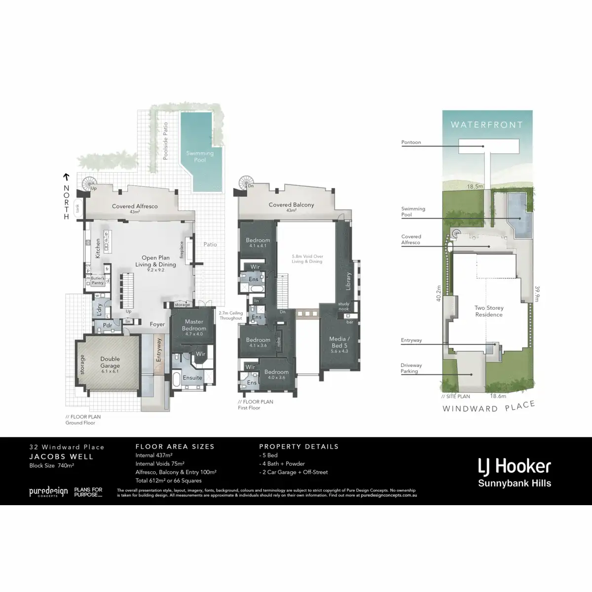 The extensive layout maximises the natural light, airflow and water views from every conceivable angle across both levels. The design incorporates a two storey wall of glass windows with huge stacker doors seamlessly connecting to the sublime outdoor entertainment patio, enormous swimming pool with sun lounging area and outdoor shower, garden with lawns and a pathway to the pontoon.