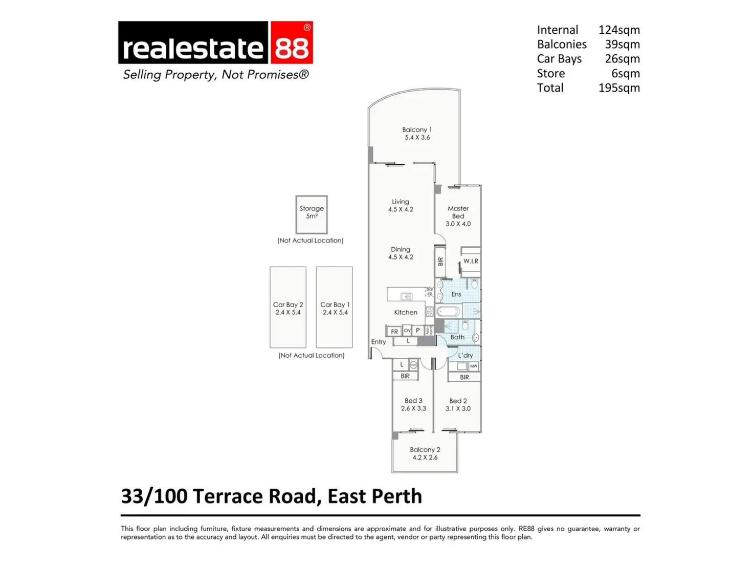 *Internal: 124sqm; balconies: 39sqm; car Bays: 26sqm; storeroom: 6sqm; total: 195sqm