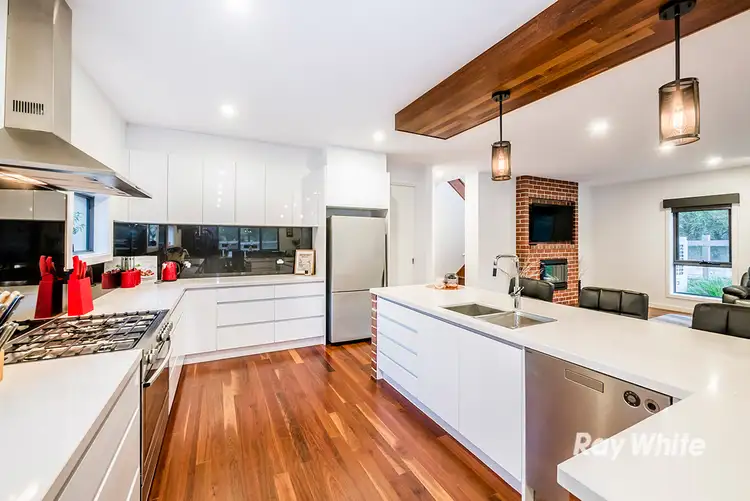 Inside, dark tinted hardwood floors and high ceilings can be found throughout much of the home including the entry and the open lounge/dining room complete with impressive red brick features around the fireplace and on the island bench in the gorgeous kitchen. With features including stone benches, stainless appliances, feature black glass splashbacks and a big walk-in pantry this area has to one of the main selling attractions!