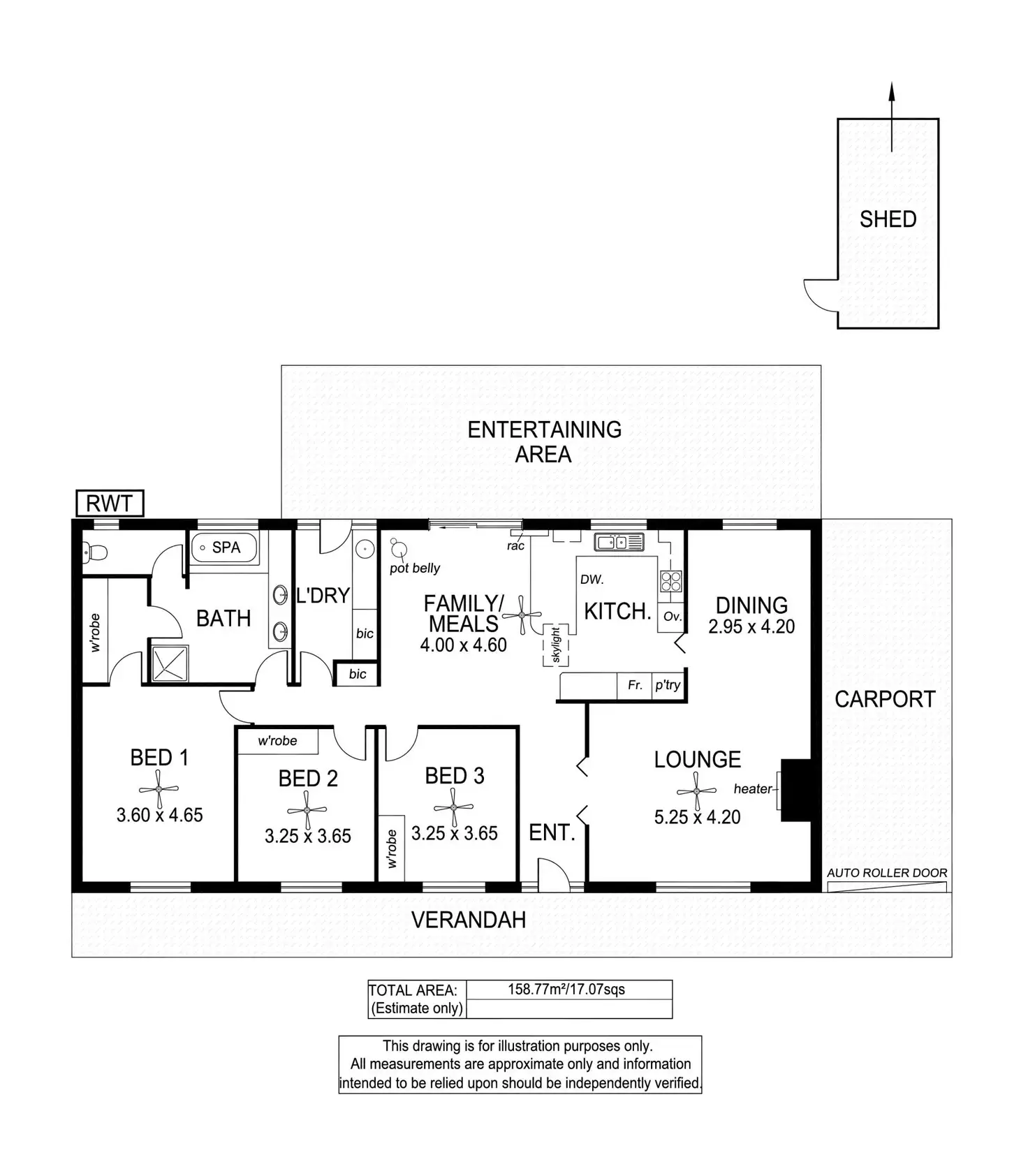 - 3 double bedrooms comfy, carpeted floors: main with ceiling fan, large walk-through robe others with Built in Robes