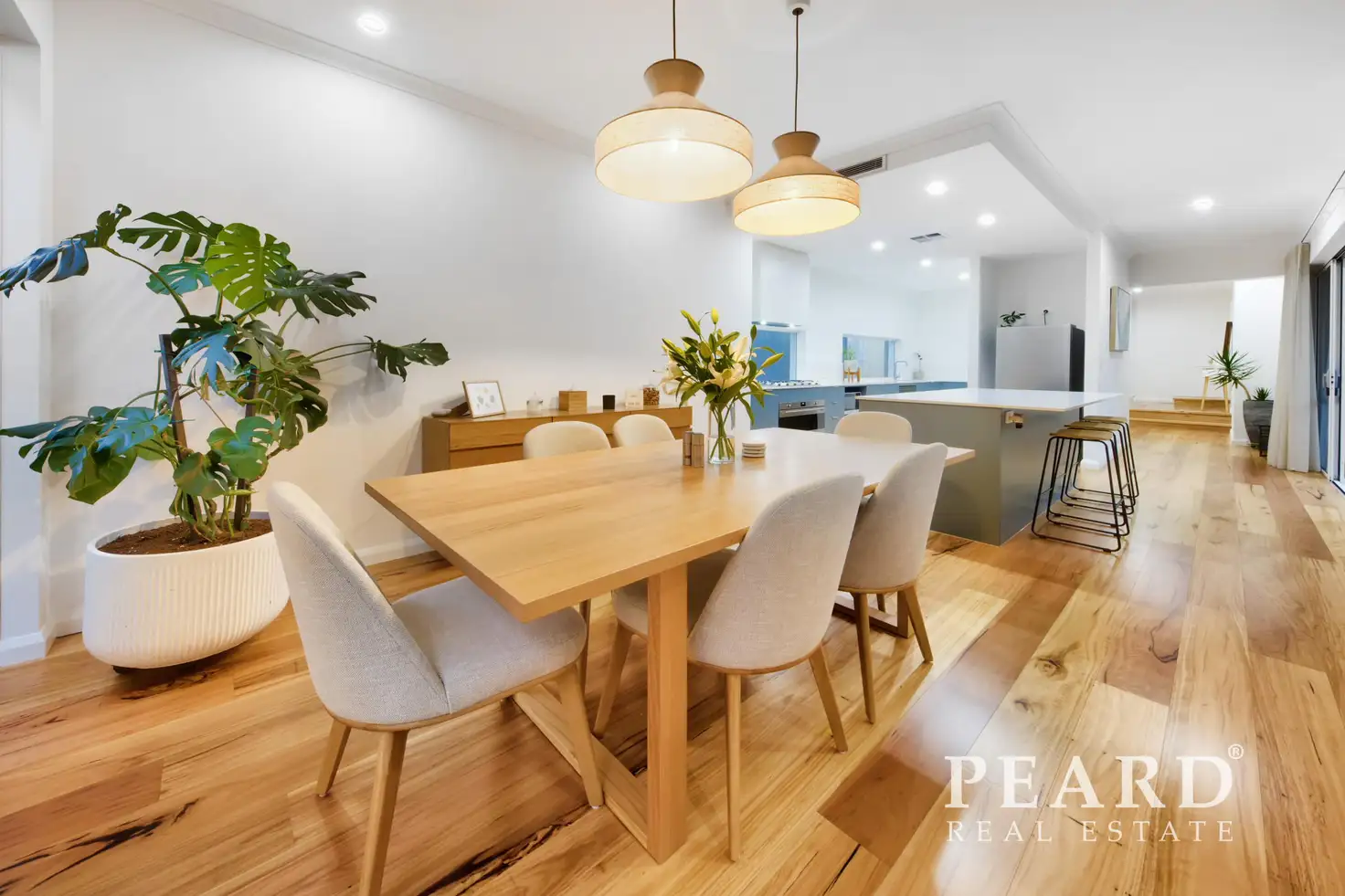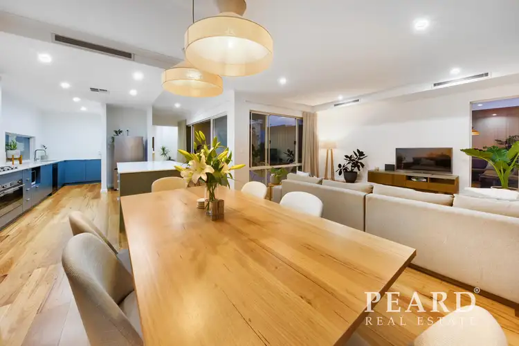 Beautiful Blackbutt timber flooring leads you into the expansive open-plan living, dining, and kitchen area, framed by surrounding windows, soaring 41-course ceilings, the space is filled with natural light and designed to feel effortlessly bright and inviting.