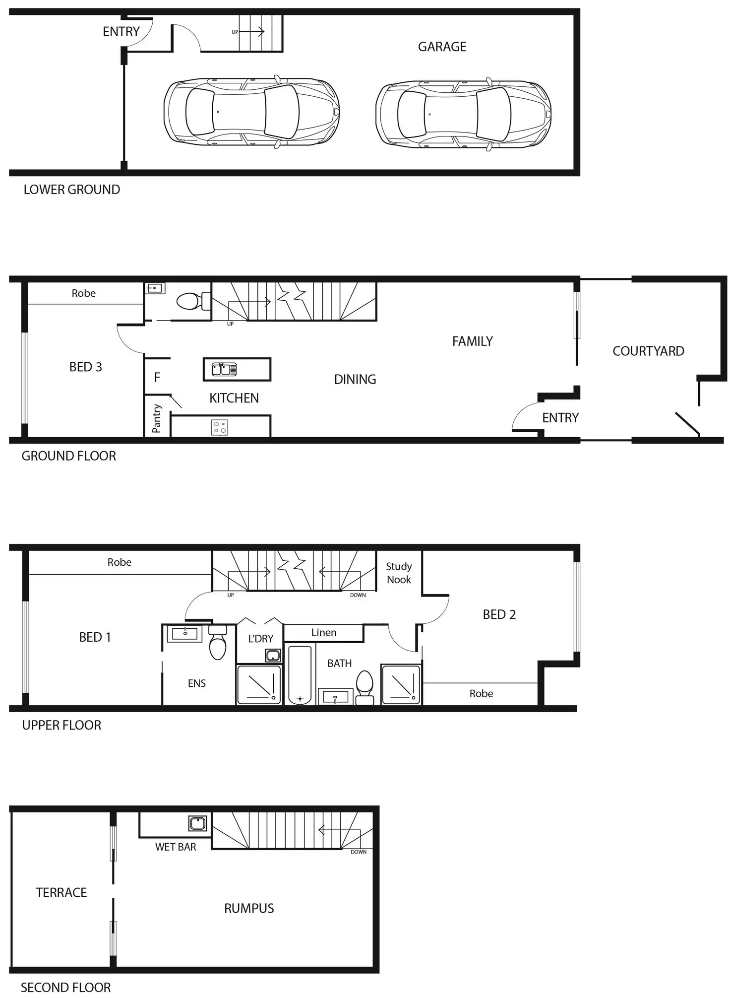 Three generous bedrooms are provided, all of which include built in robes. The master and second bedroom are located on the middle floor, while the third bedroom can be found downstairs, off the kitchen, making it multifunctional and ideal for use as a kids playroom, guest room or even a home office. The master bedroom includes a spacious ensuite with a shower, vanity, toilet and neutral colour scheme that flows though to the main bathroom that boasts a freestanding bathtub. A European style laundry can also be found on this level as well as an integrated study nook perfect for homework.
