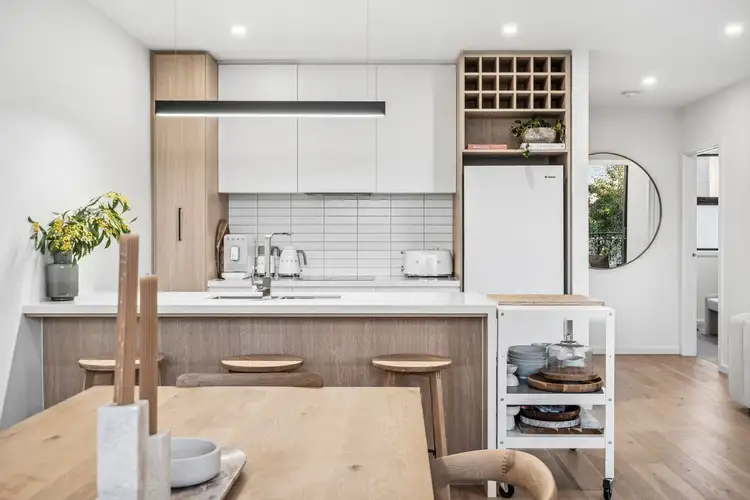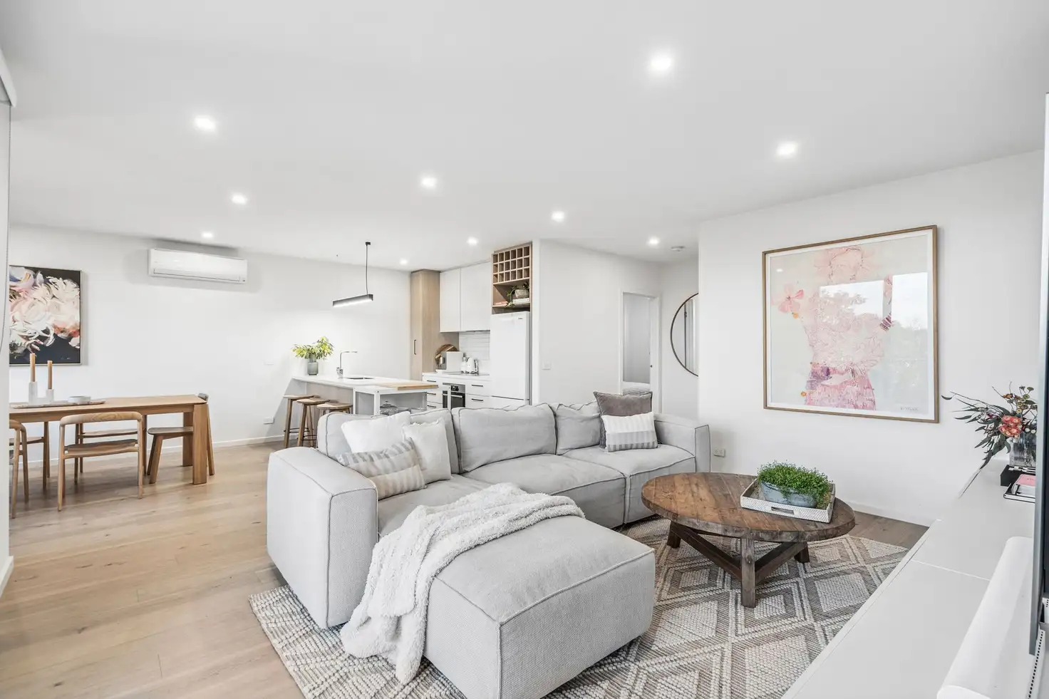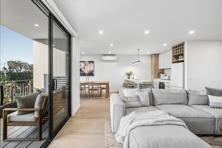 Open Plan Living/Dining: Chic engineered timber floors, floating entertainment unit, full-height glass sliding door with north-facing balcony access, dining window, roller blinds, downlights and split-system heating and cooling unit.