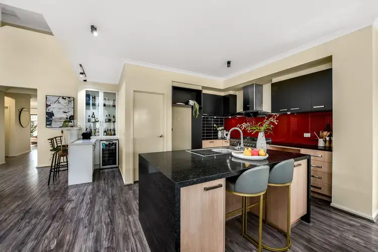 The kitchen is illuminated by contemporary LED dimmer spotlights and vaunts an opulent motif of blacks, crimson red glass splashback and oak cabinetry. Both the breakfast bar and main counter are finished in marble, while a walk-in pantry provides ample storage. A deluxe 900mm freestanding electric oven and gas cooktop will delight the home chef.
