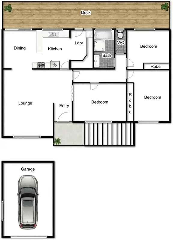 * Large entertaining deck running the length of the home, partially covered