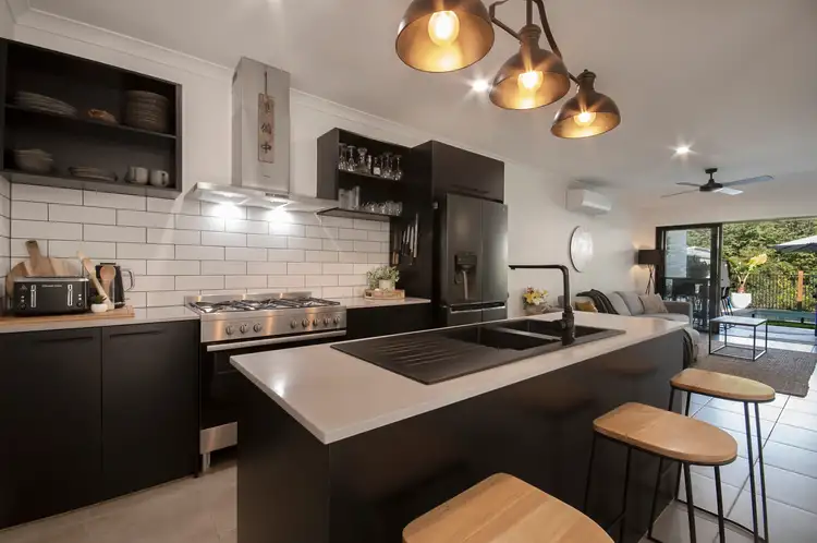 - Island bench with feature black sink, 900m gas stove and oven