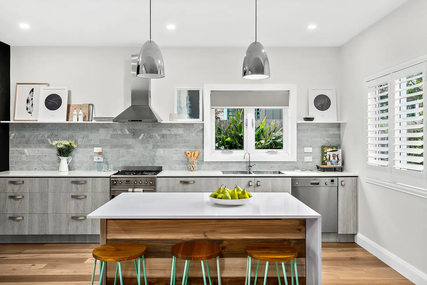 - Large contemporary kitchen, stone bench tops, free-standing Smeg gas range, marble subway tiles, views to the escarpment