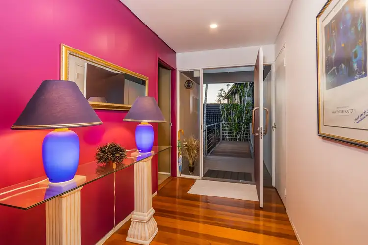 An elevated timber boardwalk leads from the paved driveway, down the side of the home to the front entry with it's oversized door, cloakroom and central curved feature wall with granite shelf and spotlight for a special artwork, sculpture or decor items