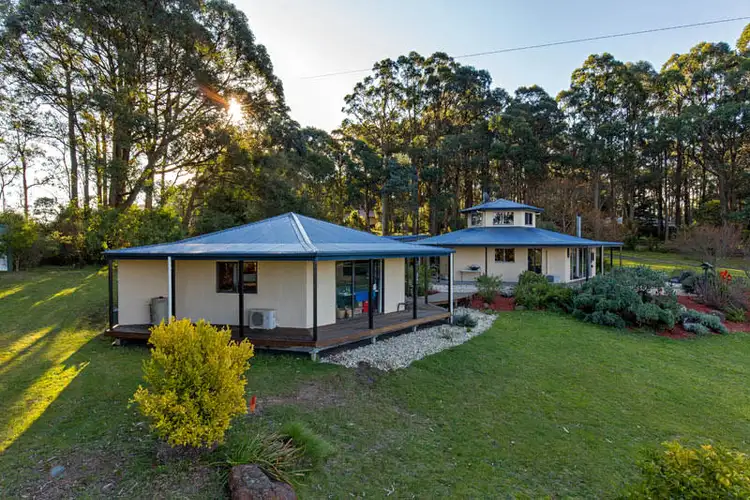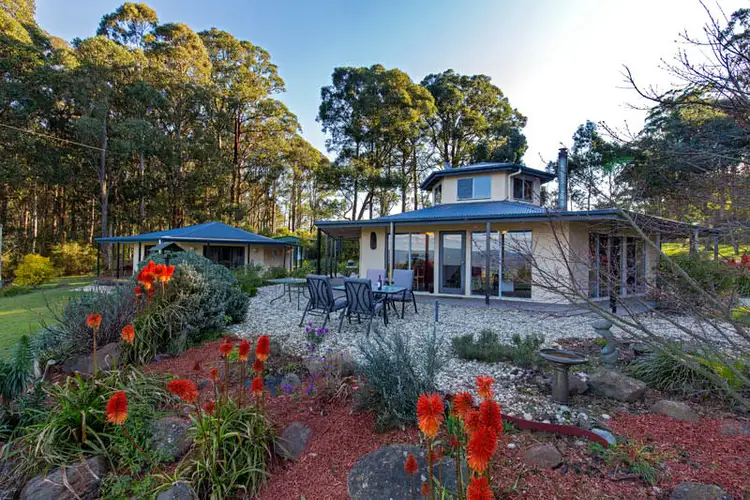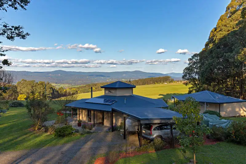 Unique country properties in this league are hard to find, offering extraordinary panoramic views, complete privacy, 8 acres of forest, a well appointed separate self-contained studio and a stylish hexagonal 2 BR home set in 2 acres of lawns and gardens. A great example of site-specific architecture, this gorgeous angular rendered brick home maintains an ambient temperature in summer and is warmed in winter by under-floor heating, an efficient Saxon wood heater and a reverse cycle split system, From its elevated positioning it commands sweeping 180 degree views, out across luscious green paddocks to the treed hills, State forest and Warburton Ranges.
