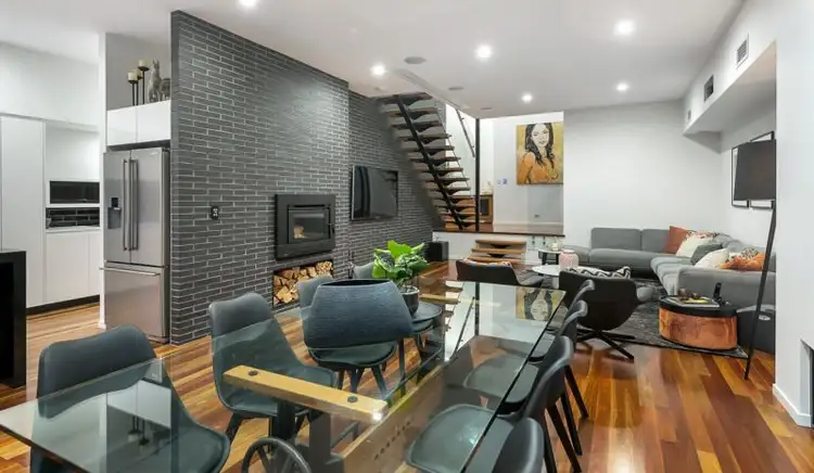 Spotted gum hardwood flooring runs throughout the free flowing living and entertaining spaces. A beautiful feature wall crafted in Spanish bricks provides a warm and organic touch to the lounge room, while a built in projection screen, surround sound and wood burning fireplace adds to the ambience and liveability.
