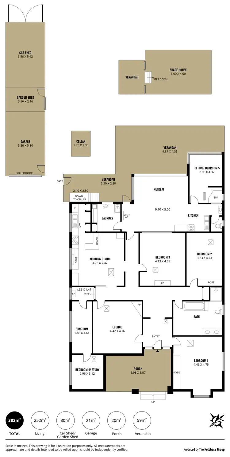 A 1.73m2 x 2.30m2 cellar, 3.56m2 x 5.80m2 garage with roller door, garden shed, and additional shed 3.56m2 x 5.92m2 approx with access.