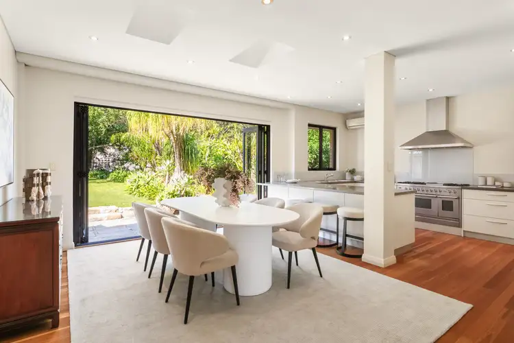 A modern stone kitchen is equipped with a chef's six-burner Ilve gas cooktop and oven plus a Bosch dishwasher and breakfast bar, while casual living/dining spills out to an idyllic backyard oasis with a sun bathed level lawn amid lush established gardens.