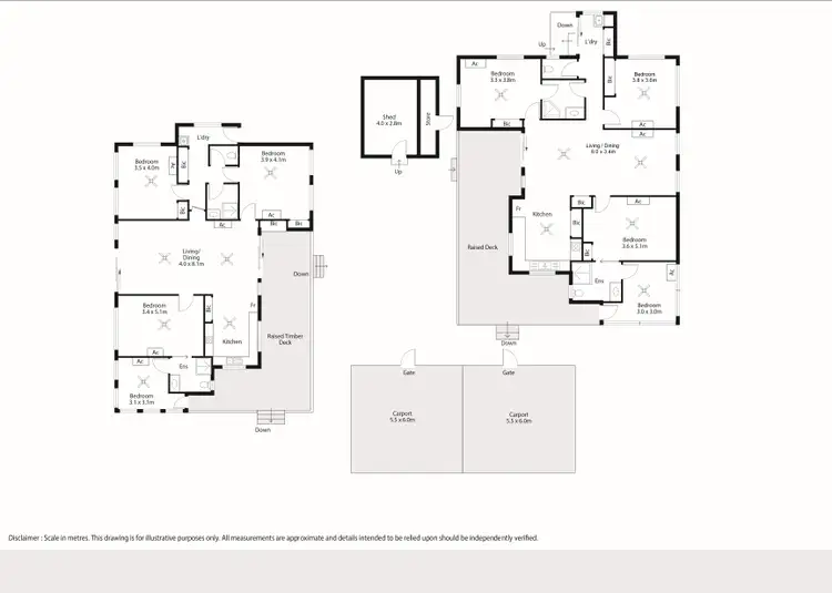 Both homes provide spacious open-plan living areas, full kitchens, and comfortable bedrooms, delivering flexibility for multiple household needs. With a total of eight bedrooms and four bathrooms, the layout supports a wide range of living or leasing options.