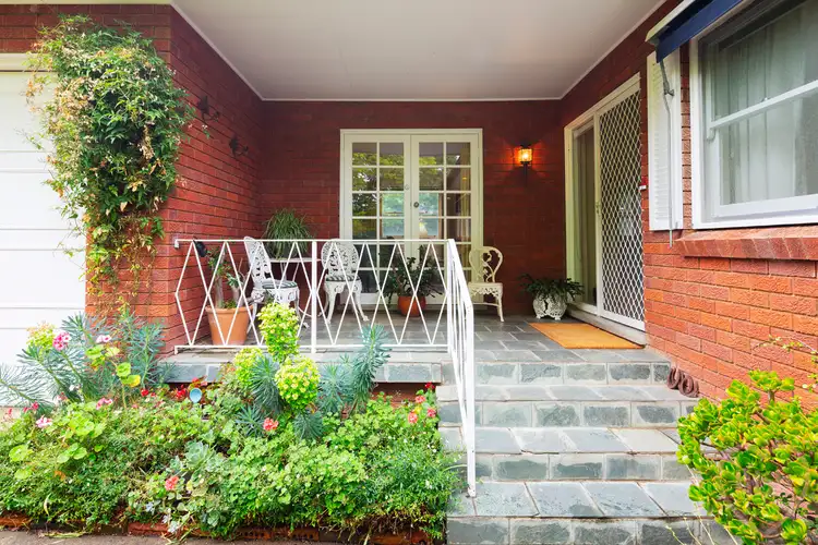 A buttercup yellow kitchen with neat rows of cupboards, clever small appliance nook/coffee station and gleaming striped timber countertops opens to a small side terrace, twined in purple flowering wisteria. And there is the neat alignment of two sunny north facing bedrooms, both with floor to ceiling built-in-robes. Classic 60s square tiles cast a chartreuse colour across the walls and tub recess, within the adjacent genteel family bathroom.