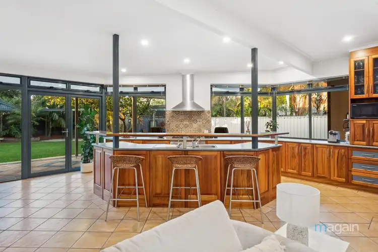The kitchen is spacious and visually striking, featuring quality timber cabinetry, a mosaic tile backsplash, and neutral countertops-perfect for any home chef. Equipped with 900mm stainless steel appliances, including a 5-burner gas stovetop with rangehood, oven, and smeg dishwasher, it accommodates both gourmet cooking and everyday meal prep with ease. A large pantry, designated fridge and microwave nooks, along with a breakfast bar, add to the kitchen's versatility. The dining area comfortably seats the whole family, while the living space, complete with a split system air conditioner, is ideal for entertaining guests year-round.
