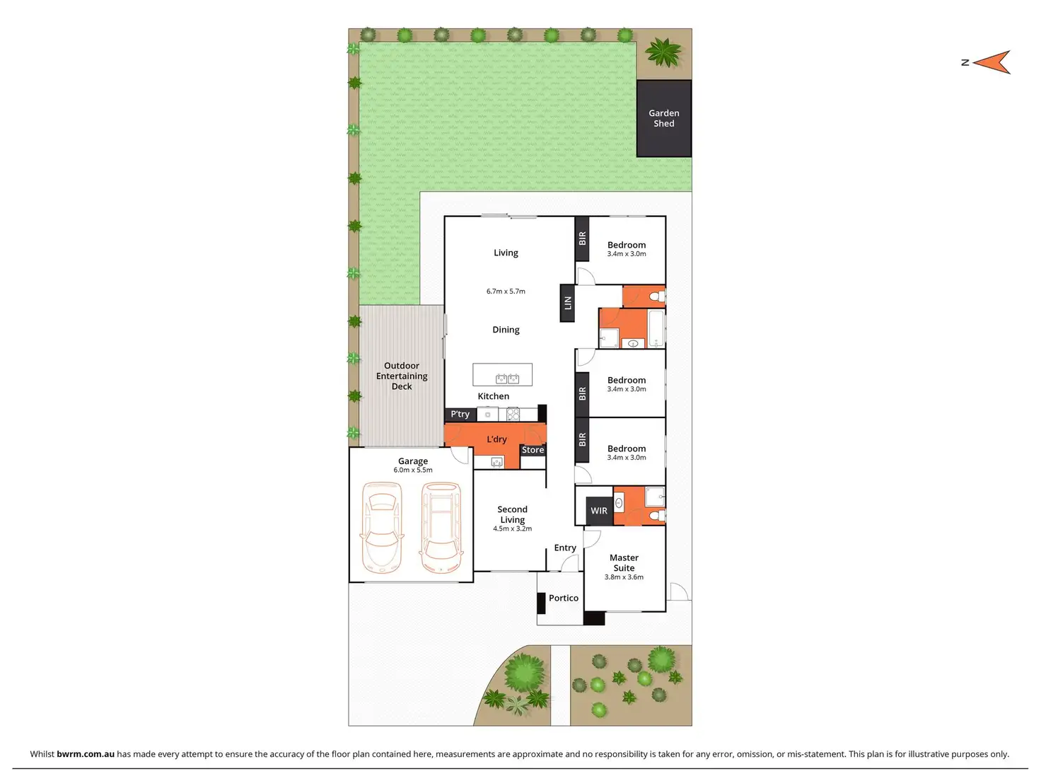 Outdoor area: Expansive outdoor entertaining deck with interior sliding door access, rear garage access, spacious landscaped backyard complete with concrete surrounds, garden storage shed, fully fenced