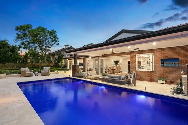 frontage, its street presence is significant, framed within immaculately landscaped lawns and gardens. Spanning over a near single level, every room is oversized with the home offering a practical, family-centric floor plan with a relaxed, luxury feel. Vast entertaining spaces and a pool at the rear capitilises on the north to rear aspect. Private, light filled and lovely, this prized offering is steps to the rail, bus, Killara Park and Killara High School.