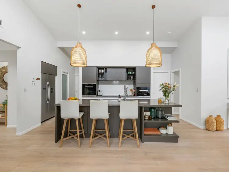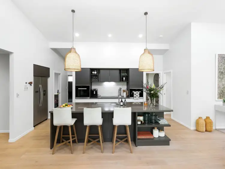 The detail is impressive with quality fixtures throughout including a Miele pyrolytic oven and steam oven, a large walk-in pantry, stone benchtops, soft close drawers, an Italian tile splashback and breakfast bar seating. With engineered oak floors in the living areas, luxurious carpet in the bedrooms, 5-zone Daikin climate control, double garage with front and rear access, a well-equipped laundry, solar power, water tanks and ample storage space throughout, nothing has been left out.