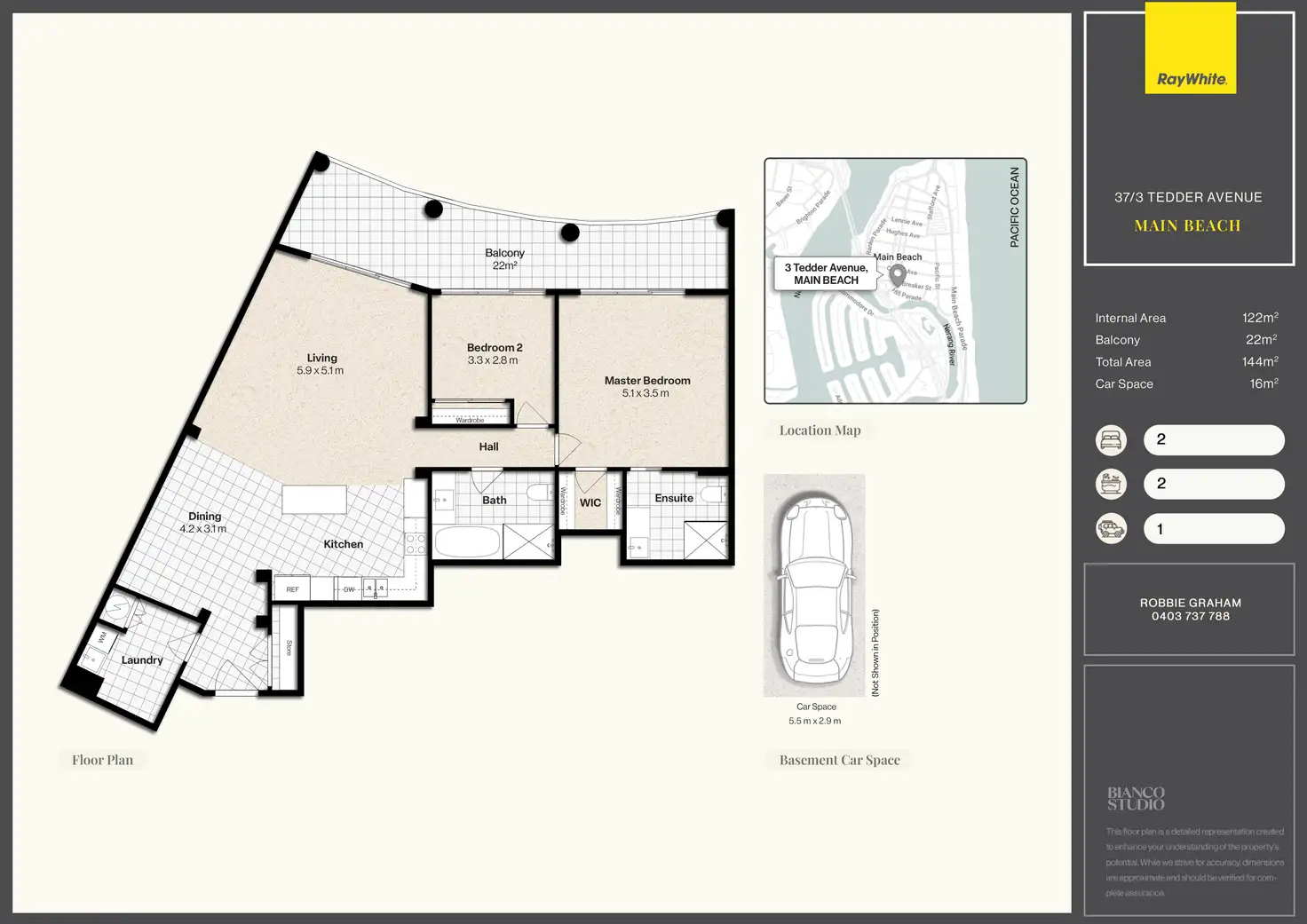 Spanning an impressive 144sqm, the apartment has undergone a renovation with every detail thoughtfully considered. Perfectly positioned between the peaceful waterways and pristine shoreline of Main Beach, the residence enjoys sweeping vistas from every room, creating a sense of tranquillity and escape.