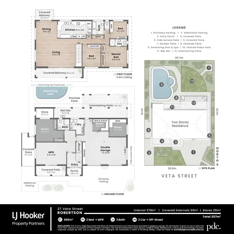 Ascend the stairs to the second floor, where open plan living and dining spaces shine with retro sophistication. Polished timber floors, elegant timber feature walls, and unique touches like mirrored glass shelving and wall sconces add timeless charm, while ceiling fans and air conditioning ensure comfort year-round. Dual sliding doors lead to large front and rear balconies--perfect for relaxed evenings overlooking the pool or enjoying cool breezes.